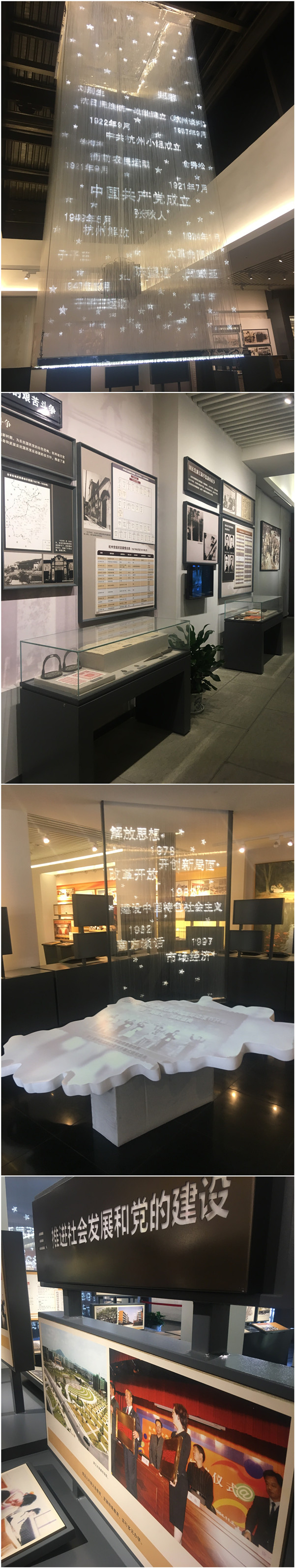 走进党史馆院子,“中国共产党杭州历史馆”鲜红的大字赫然映入眼帘。该位置始建于1926年的菩提精舍,后历经改造,于2015年5月1日正式对外开放。馆内占地面积约3000平方米,按历史脉络和时间顺序,分设“民族独立人民解放的杭州篇章”、“推进社会主义建设的杭州记忆”和“走中国特色社会主义道路的杭州实践”三个展厅。整个展馆,以历史为核心,但又处处充满科技感。巨大的白色梦幻光纤灯从屋顶垂落,如同一块电影荧幕,展示了杭州90多年的重大历史事件、人物及时间。