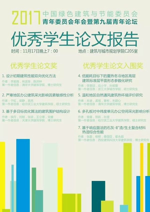 近日在深圳大学召开的“2017中国绿色建筑与节能委员会第九届青年论坛”上,我院2017级硕士联培研究生李雯喆同学以《低能耗目标下的夏热冬冷地区高层建筑标准层平面形态参数化研究——以L形平面为例》获“优秀学生论文入围奖”,并在获奖仪式上作学术报告。